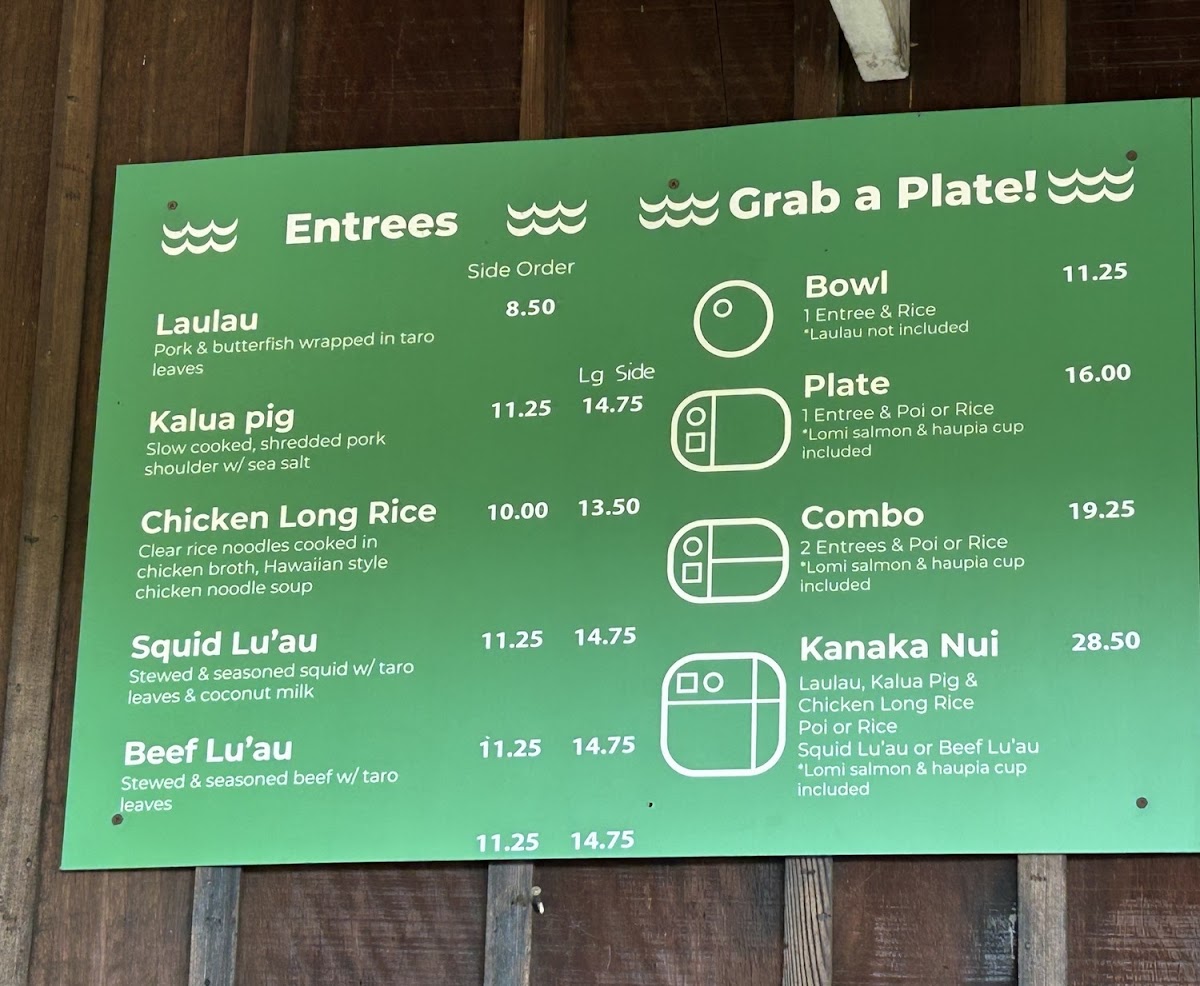 The menu offers a selection of traditional Hawaiian dishes primarily served as plates and sides, suitable for lunch or casual dining. Visitors can choose from various plates featuring a choice of rice or poi accompanied by one or two entrees such as Kalua Pig, Laulau, Chicken Long Rice, and Lomi Salmon. There are also larger combination plates that include multiple entrees and traditional sides.